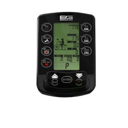 Тренировочный компьютер Bronze Gym A1000M PRO TURBO оборудован многофункциональным LCD-дисплеем. На экране отображаются следующие данные: время, скорость, дистанция, расход калорий, пульс, темп, Ватт, интервал. В число самих программ входят 3 режима интервальных тренировок. Достичь конкретные спортивные задачи помогут целевые тренировки (время, дистанция, калории). Помимо предустановленных программ, можно воспользоваться программой быстрого старта с регулировкой всех показателей. Для тренировок с контролем пульса подойдет пульсозависимая программы. Для точного определения пульса и просто комфортной тренировки в компьютер встроен беспроводной приемник (нагрудный ремень-передатчик приобретается отдельно). Для бутылочки с водой предусмотрен специальный держатель.