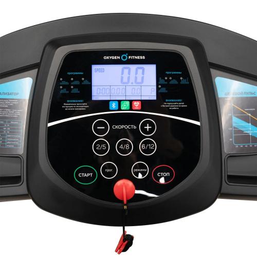 - OXYGEN FITNESS REVIVE C оснащена LCD дисплеем с голубой индикацией, который отображает важные параметры: время, скорость, дистанцию, количество сожженных калорий, пульс и выбранную программу. Дорожка предлагает 14 различных программ, включая быстрый старт, 9 предустановленных и 3 режима обратного отсчета, а также функцию жироанализатора. Bluetooth-соединение позволяет интегрировать дорожку с мобильными приложениями, такими как Fitshow™, Kinomap™ и Zwift™, что делает тренировки более разнообразными и увлекательными.