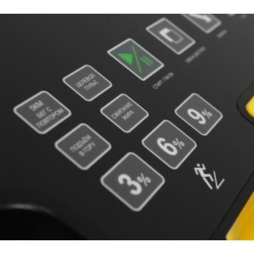 Тренировочный компьютер оборудован профессиональным LED-дисплеем с точечной матрицей. Основной экран дополняют 3 дополнительных буквенно-цифровых LED-дисплея. На мониторах отображаются следующие данные: тренировочный профиль, время, скорость, дистанция, калории, пульс, угол наклона, счет шагов. Все клавиши и дисплеи оснащены белой подсветкой, а надписи русифицированы. Эргономичные регуляторы скорости и угла наклона выполнены в виде джойстиков. В число самих программ входят 10 режимов, направленных на решение самого широкого спектра задач – от развития силы до снижения веса. Помимо предустановленных программ, можно воспользоваться самостоятельно регулируемым ручным режимом. Здесь также есть 3 целевые тренировки (время, дистанция, калории) и 3 пульсозависимые. Для точного определения пульса и просто комфортной тренировки в компьютер встроен высокоточный беспроводной приемник (рекомендуется использовать телеметрический ремень-передатчик).