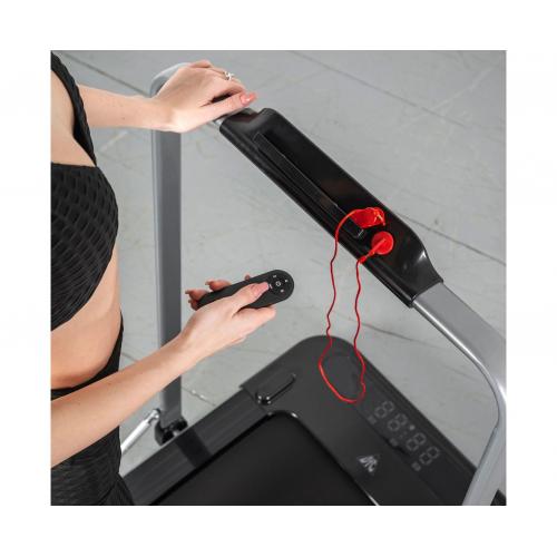 Беговое полотно размером 110х42 см имеет нескользящее покрытие для безопасных тренировок. На переднем поручне расположена подставка под смартфон. Беговая дорожка имеет прочную конструкцию и выдерживает вес пользователя до 110 кг.