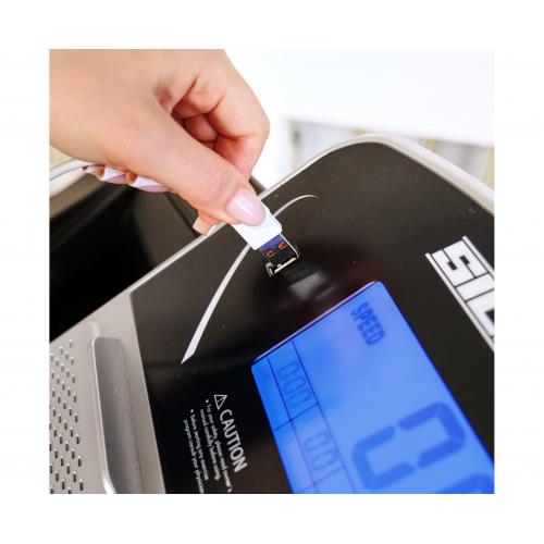 Большой 5-дюймовый LCD-дисплей с синей подсветкой отображает время, скорость, расстояние, калории и пульс, позволяя контролировать процесс тренировки. Мультимедиа с двумя динамиками и разъёмами MP3, USB делают занятие более комфортным и приятным.