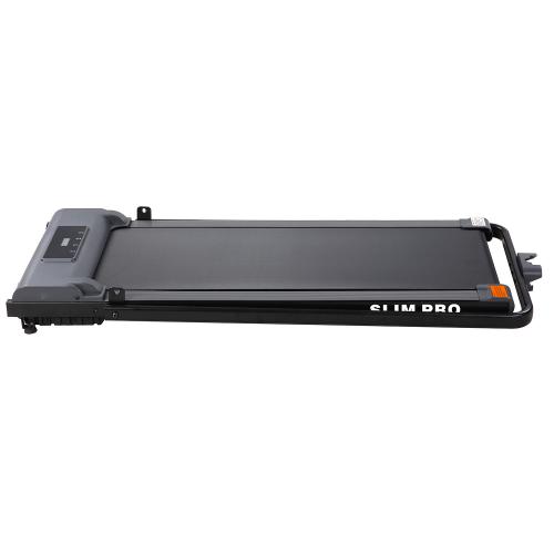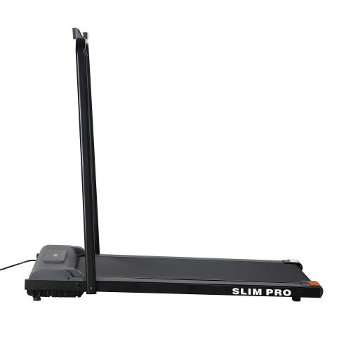 - На дорожке установлен удобный складной поручень с держателем под девайс и пульт. После занятий поручень убирается, и тренажер получается очень тонким, всего 12,5 см.
