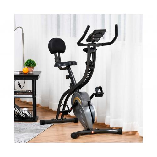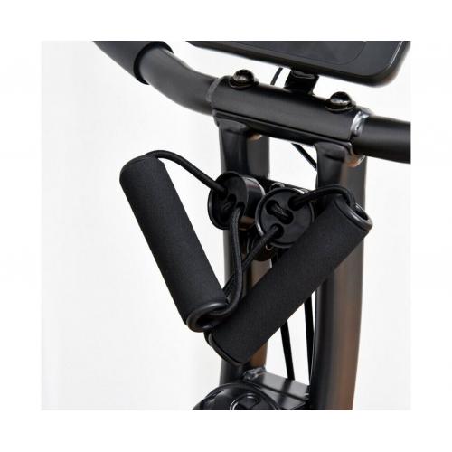 Для удобства пользователя велотренажер оснащен регулируемым по высоте сиденьем (5 уровней), передней опорной стойкой с 2 подвижными колесами для удобства транспортировки, педалями с регулируемыми ремешками и компенсаторами неровности пола. Велосипед удобно складывается и экономит место, а также имеет подставку под планшет.