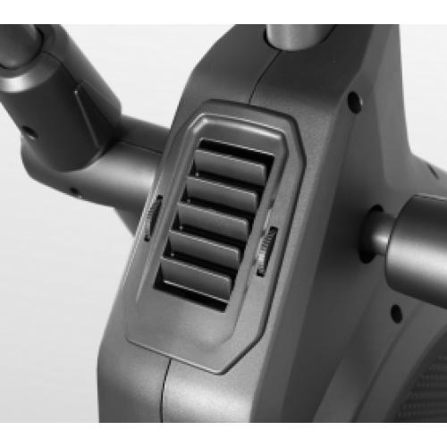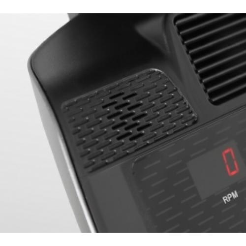Тренировочная консоль BRONZE GYM XR812 LC рассчитана на коммерческое использование и представляет собой LED дисплей и 4 буквенно-цифровых экрана. Основной LED дисплей отображает программные профили, а буквенно-цифровые экраны выводят все необходимые параметры тренировки. В число самих программ входят 22 различных режима, куда относятся 12 предустановленных программных профилей, ручной режим, 4 пульсозависимые и 4 пользовательские программы, а также Ватт режим (диапазон нагрузки находится в диапазоне от 10 до 350 Ватт). Здесь также есть жироанализатор (Body Fat) и функция оценки восстановления организма после физических нагрузок (Recovery). Мультимедийная компонента представлена динамиками мощностью 3 Ватта, а также разъемом AUX IN для подключения мобильных устройств и воспроизведения через них аудио-файлов. Есть также USB вход, он используется для зарядки смартфонов и планшетов. Полезная опция - подставка под мобильные устройства, во время тренировки можно смотреть фильмы или серфить в интернете. Кстати, в XR812 LC предусмотрены 2 подставки - одна для телефона, вторая для планшета. Оригинально сделаны вентиляторы - их тоже два. Один направлен на лицо и шею, второй - на торс. Эллипс имеет транспортировочные ролики и компенсаторы неровностей пола. Максимальный вес пользователя 160 кг.