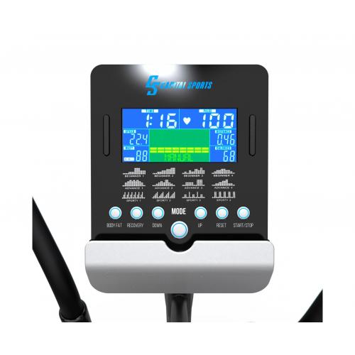 Дисплей монохромный LCD и отображает время, скорость, расстояние, калории и пульс. Сенсорные датчики пульса расположены на поручнях. Тренажер предусматривает 12 программ тренировок. Также имеется держатель для планшета, функция bluetooth и USB вход для музыки и зарядки устройств.