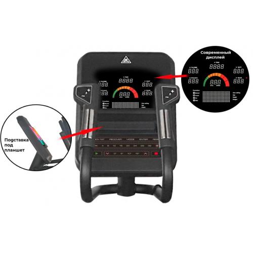 Для занятия можно выбрать одну из 12 встроенных программ тренировок, каждая из которых адаптирована под определённые требования. Большой цветной дисплей отображает основные показатели: скорость, дистанцию, уровень сложности, время занятия, расстояние, количество сожжённых калорий, пульс. Датчики пульса расположены на поручнях. MP3 и USB вход позволяют прослушивать музыку во время тренировки.