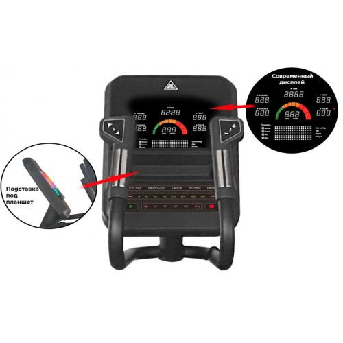 Имеется 12 предустановленных программ для тренировок. Уникальный цветной дисплей — такой практически не встретить среди других аналогов. На нём отображаются: время занятия, скорость, уровень сложности, расстояние, затраченные калории, пульс, который считывается с датчиков на поручнях. Имеются MP3 и USB входы на передней консоли, а также подставки под планшет и бутылку.