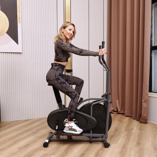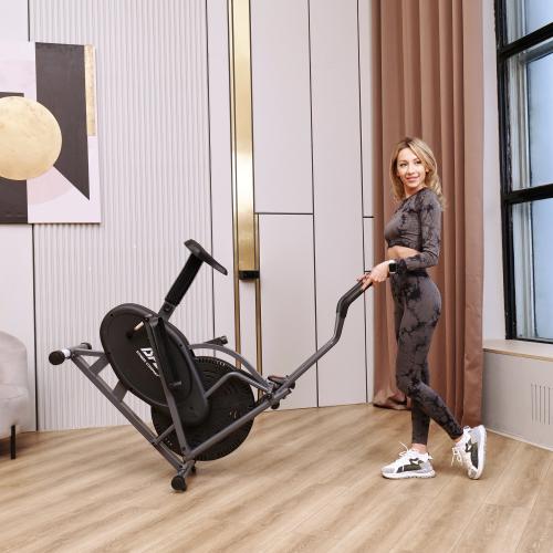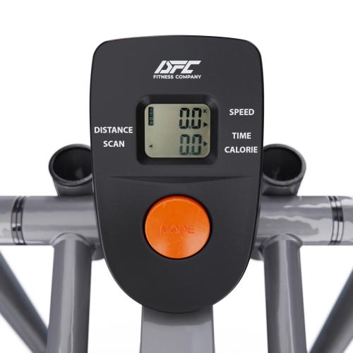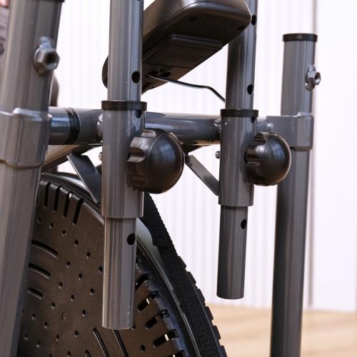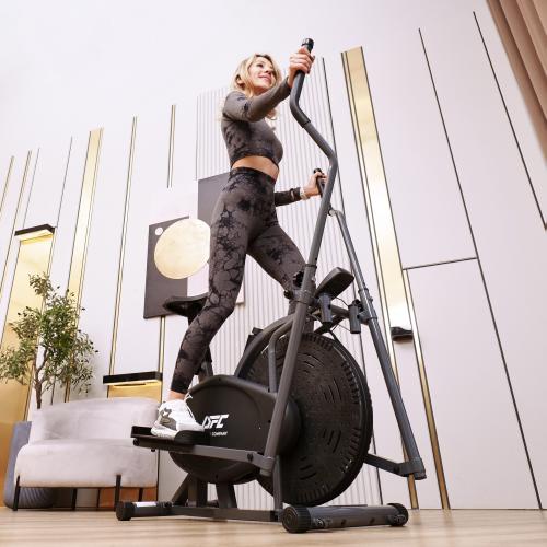 • Эллиптический тренажёр с сиденьем DFC E8.2A оснащён передним маховиком, что обеспечивает плавный и тихий ход. Благодаря двум положениям поручней (свободное и статичное) и регулировке на 4 уровня по высоте, вы сможете настроить тренажёр под себя. В свободном положении поручней тренажёр работает как эллиптический, а в статичном — как велотренажёр.