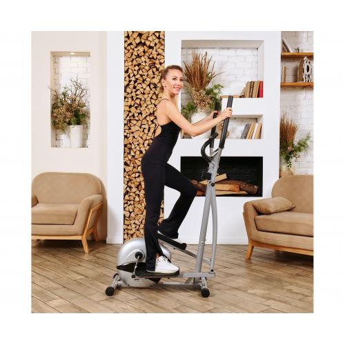 - Благодаря компактным размерам и компенсаторам неровности пола, тренажёр легко разместить в любом помещении. Сенсорные датчики на поручнях позволяют контролировать пульс во время тренировки.
