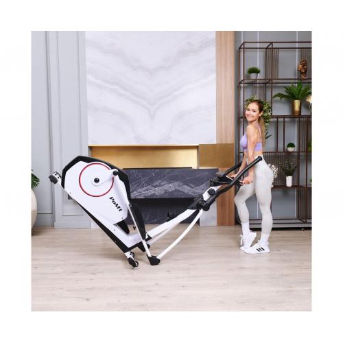 - В конструкции предусмотрена подставка для планшета и держатель для бутылки, что делает тренировку более комфортной, а транспортировочные ролики помогают удобно перемещать тренажор по комнате.