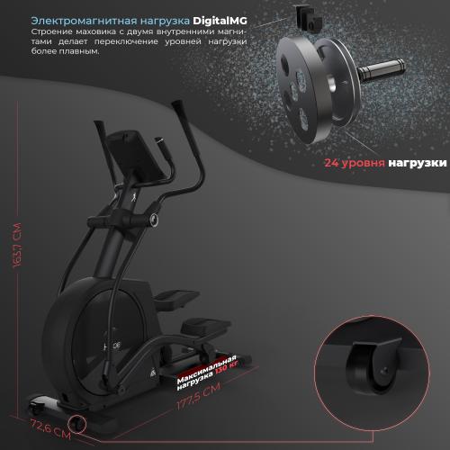 Тренажёр с магнитной системой нагрузки с электроприводом, маховик весом 5 килограмм обеспечивает плавное переключение режимов нагрузки. Предусмотрено 24 уровня, которые переключаются плавно, без резких рывков.