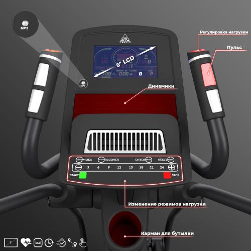 Эллипс оснащён 5’ LCD монитором, на котором отображаются скорость, время занятия, дистанция, калории и пульс. Имеется 12 встроенных программ и ручной режим для индивидуальной настройки.