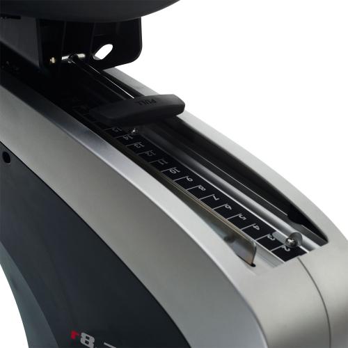 Велотренажёр оборудован сиденьем, положение которого можно подстроить под свои индивидуальные параметры при помощи регулировочного рычага. Отодвиньте рычаг в сторону, после чего установите сиденье в удобное для вас положение и верните регулировочный рычаг на место.