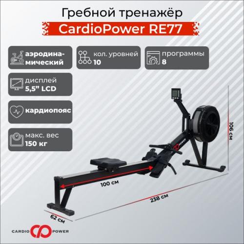 - Гребной тренажёр CardioPower RE77 обновленная и доработанная версия ранее популярной одноименной модели, имеет эргономичную конструкцию, оснащен аэродинамической системой сопротивления, усиленной рамой и возможностью компактного складывания. Предназначен как для комфортных, так и для высокоинтенсивных HIIT тренировок.