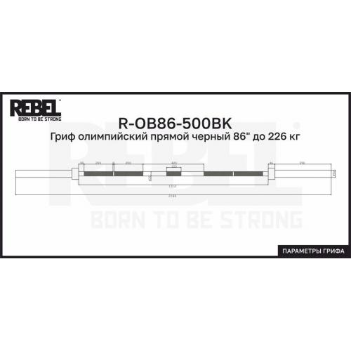 Гриф олимпийский прямой черный 86" до 226 кг REBEL R-OB86-500BK предназначен как для коммерческого, так и для индивидуального домашнего использования. Соответствует олимпийским стандартам. Длина 218,4 см. Вес 20 кг. Максимальная нагрузка 226 кг.