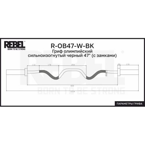 Гриф олимпийский сильноизогнутый черный 47" REBEL R-OB47-W-BK поставляется с пружинными замками FT-OC51-SRR. Вес грифа – 10 кг. Максимальная нагрузка – 136 кг. Длина грифа 1214 мм.