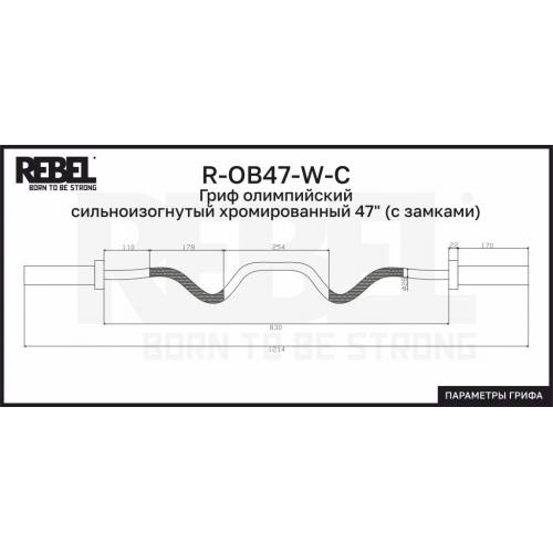 Гриф олимпийский сильноизогнутый хромированный 47" REBEL R-OB47-W-C поставляется с пружинными замками FT-OC51-SRR. Вес грифа – 10 кг. Максимальная нагрузка – 136 кг. Длина грифа 1214 мм.