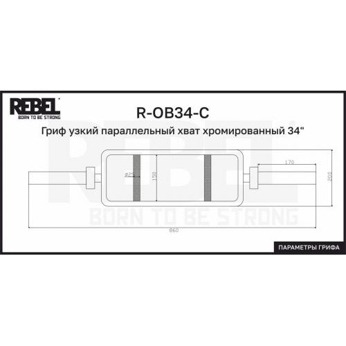 Гриф узкий параллельный хват хромированный 34" REBEL R-OB34-С изготовлен из высокопрочный стали. Замки FT-OC51-SRR в комплекте. Максимальная нагрузка - 150 кг. Длина грифа 860 мм. Длина посадочной втулки - 170 мм. Диаметр посадочной втулки - 50 мм. Диаметр хвата - 25 мм. Предназначен для коммерческого и домашнего использования.