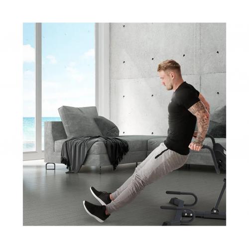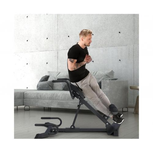- Тренажер поддерживает широкий спектр упражнений: гиперэкстензии, скручивания, боковые наклоны, отжимания, сгибания рук, приседания и многое другое. Это делает его идеальным выбором для домашних условий, позволяя заменять сразу несколько спортивных снарядов одним устройством.