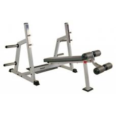 Скамья со стойками для жима штанги под углом вниз с упором для ног и платформой для страхующего
