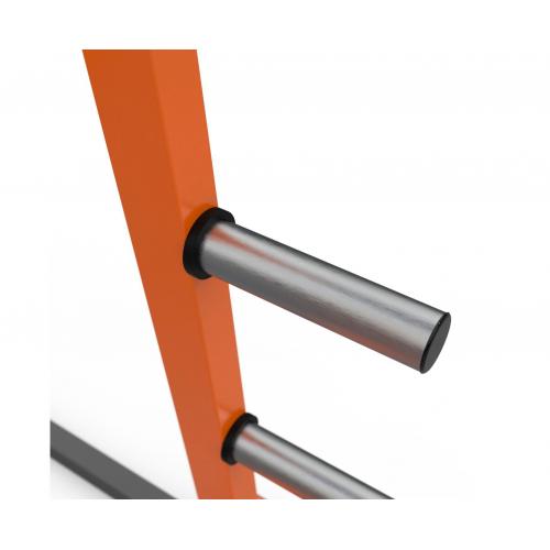Диаметр дисков для хранения 51 мм, нагрузка на каждый из держателей дисков до 60 кг. Размер основной рамы 70 х 50 х 2 мм, размер соединительных перекладин 50 х 50 х 2 мм. Высота грифа регулируется по высоте в 10-ти положениях.