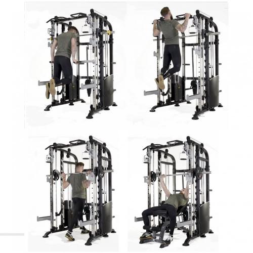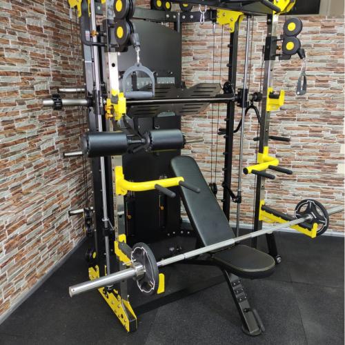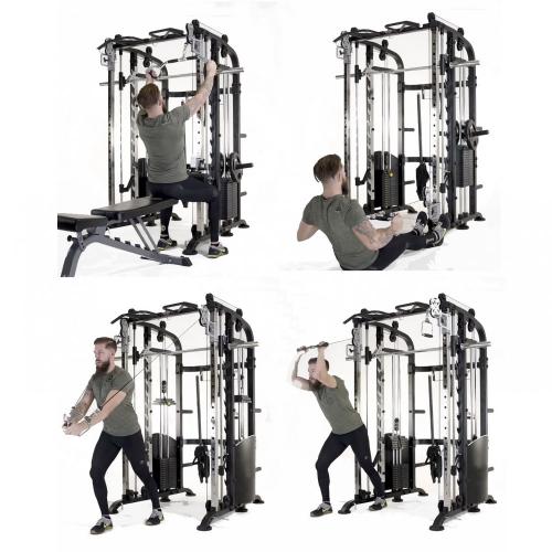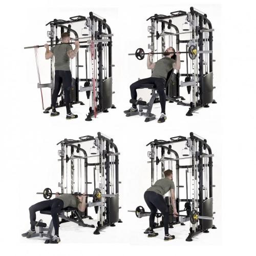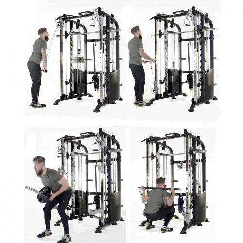 Ролики: Группы преобразованных роликов двигаются более плавно, при этом сохраняя вес. Гибкий, износостойкий и безопасный трос толщиной 5 мм выдерживает вес до 800 кг Удлиненный дизайн кольцевого зажима обеспечивает плотное сцепление и ударочность конструкции. Благодаря серии слотов для фиксации грифа штанги на любой высоте тренажер подходит как для низких, так и для высоких пользователей. Длинная предохранительная стойка. Стойка для пресса устойчива к износу и деформации. Тренажер включает в себя 10 аксессуаров, а количество выполняемых на нем упражнений неограниченно.