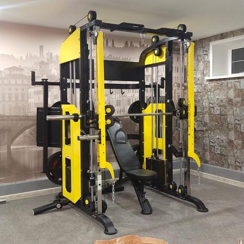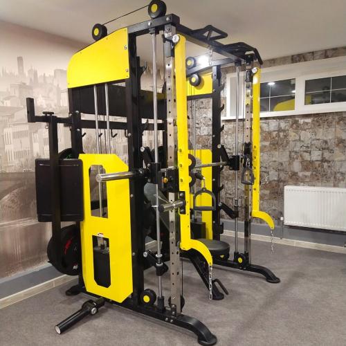 - Машина Смита, - кроссовер, - силовая рама, - тяга снизу и сверху, - турник с различными вариантами хвата для подтягиваний, - брусья для отжиманий, - Жимовые рычаги - Платформа для жима ногами - различные аксессуары для выполнения силовых упражнений, - места для хранения аксессуаров и дисков.