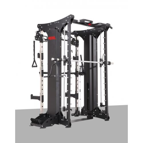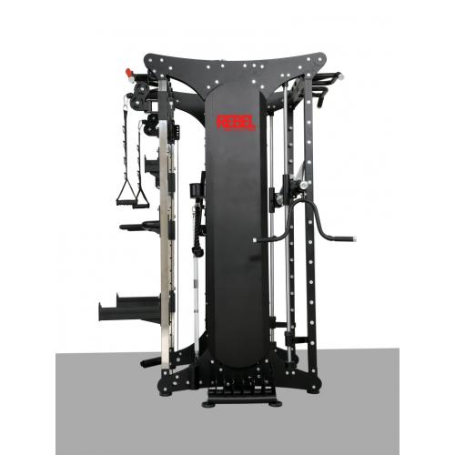 - На силовой раме тренировочного комплекса REBEL RDT803-90 расположены две пары перемещаемых по высоте страховочных захватов разной длины для работы с независимым грифом.