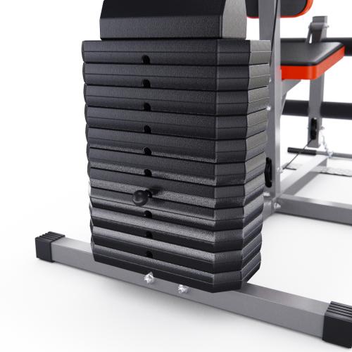 - Комплекс не требует дополнительных снарядов - он полностью автономный. В комплект входит весовой стек массой 60 кг: 11 пластин по 5 кг и верхняя пластина 5 кг. Ролики на подшипниках обеспечивают плавное движение. Стальной трос в защитной оплетке так же гарантирует безопасность при выполнении упражнений.