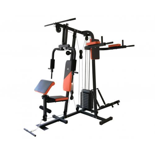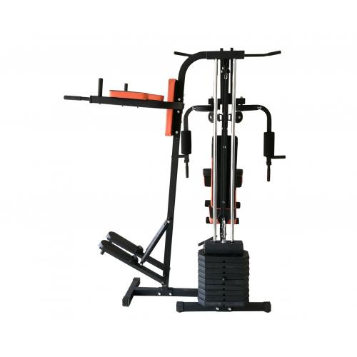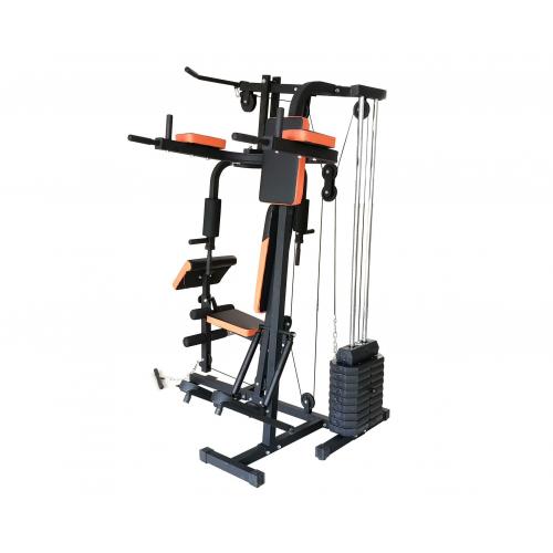 Многофункциональный тренажер с встроенным весовым стеком. Позволяет выполнять комплекс упражнений на различные группы мышц. Дополнительно тренажер имеет брусья для отжимания и степпер с гидроцилиндрами.