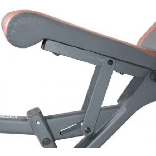 Тяжелая жимовая скамья с мощным профилем 76 мм. оптимально подходит для использования дома и залах с небольшой проходимостью. Построенная на высокопрочной раме 40*80 мм., скамья выдерживает совокупную нагрузку до 250 кг. Наклон подушки спины регулируется в положительном и отрицательном диапазонах от 80 до -30 градусов, само же сидение регулируется в двух положениях. Большие валики комфортно фиксируют голеностопы при выполнении различных упражнений - впрочем, при желании, этот блок можно отсоединить.