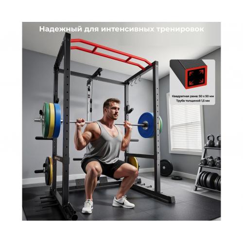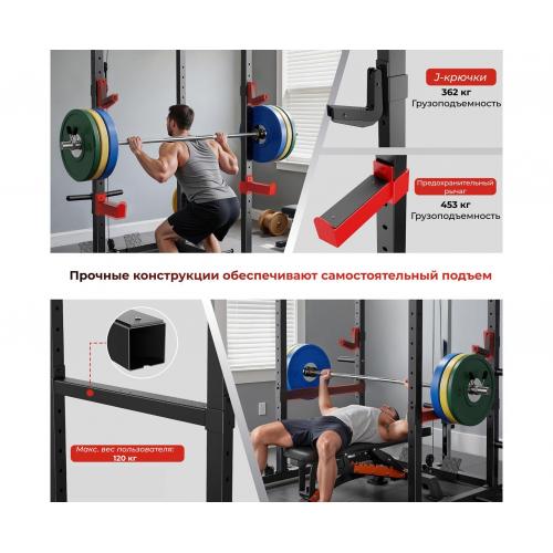 - Тренажёр подходит для приседаний, жима лёжа, становой тяги, упражнений со штангой, а также для развития спины, груди, рук и ног, заменяя полноценный спортзал дома. Защитные рамы выдерживают повышенные нагрузки, обеспечивая безопасность во время силовых тренировок. Телескопическая труба, стойка для хранения блинов и прочие элементы конструкции обладают высокой прочностью, что делает тренажёр идеальным для регулярных домашних занятий.