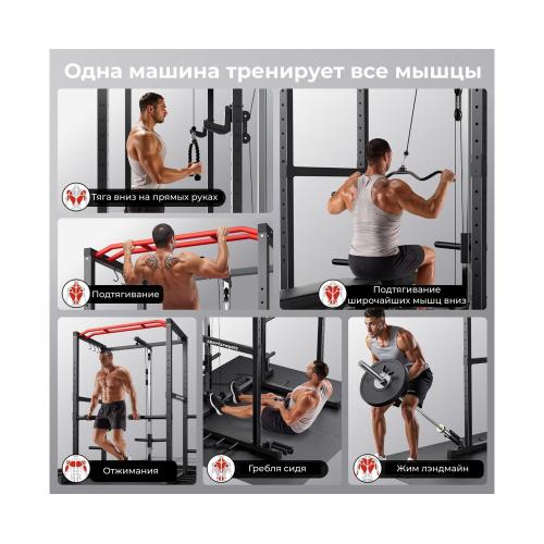 - Модель оснащена системой верхних и нижних тяг, что позволяет выполнять вертикальную тягу широким и узким хватом, горизонтальную тягу сидя, тягу прямыми руками, поворот рукоятки на полный угол и разгибания на трицепс. Шкивы с прецизионными подшипниками обеспечивают плавность и мягкий ход. Телескопические стойки имеют защитное покрытие, устойчивое к коррозии, и рассчитаны на длительный срок эксплуатации. Конструкция включает четырнадцать уровней регулировки высоты, позволяя подстроить раму под задачи спортсмена.
