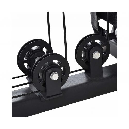 - Верхняя тяга (W-образный гриф в комплекте). Ручки грифа рифлёные, с нескользящей поверхностью. Максимальная нагрузка — 130 кг. Используется для тренировки мышц рук (бицепс, трицепс) и спины.