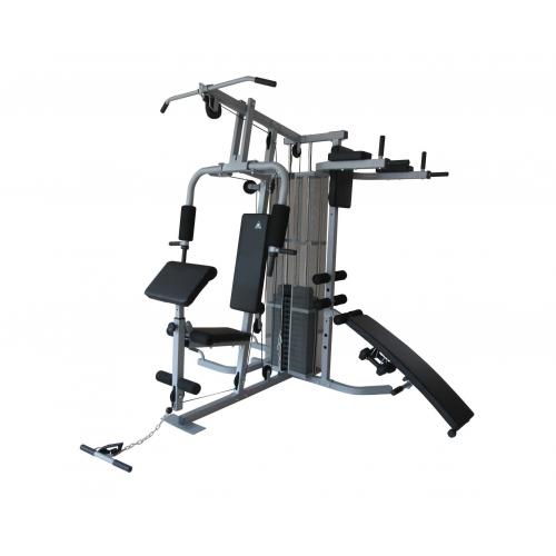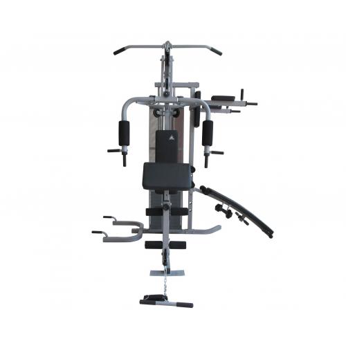 Многофункциональный тренажер с встроенным весовым стеком. Позволяет выполнять комплекс упражнений на различные группы мышц. Дополнительно тренажер имеет брусья для отжимания и скамью для пресса с гантелями по 1,5 кг с регулировкой по углу наклона.