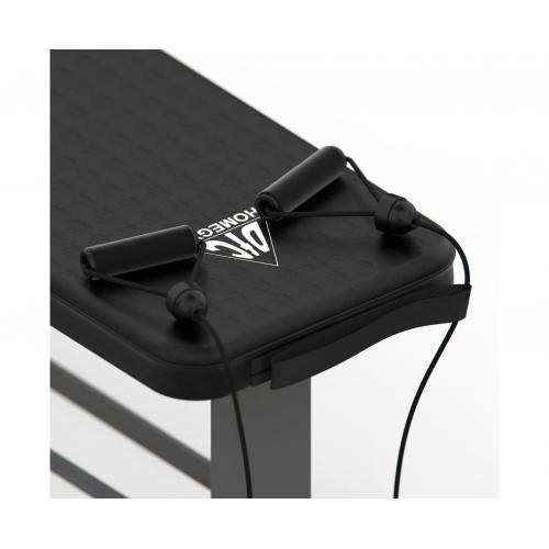 Скамья дополнительно оснащена креплениями для гантелей для удобного хранения, а также быстрого доступа к ним во время тренировки. Валик для ног диаметром 7,5 см и длиной 13,2 см с надежным креплением длиной 34 см. Эспандеры, поставляющиеся в комплекте длиной 80 см служат для дополнительного укрепления мышц рук.