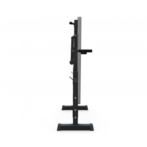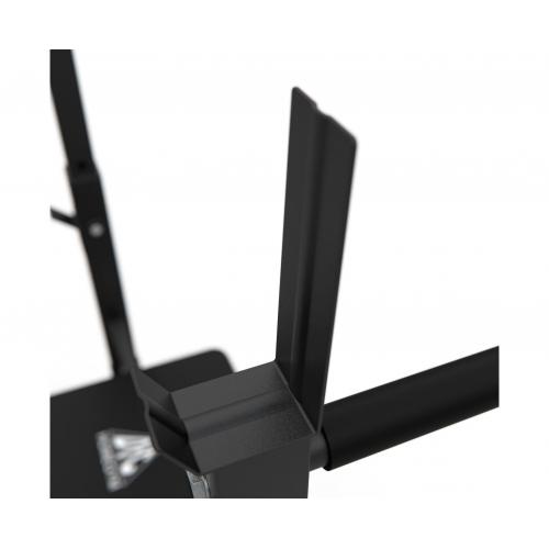 - Максимальная нагрузка на верхний держатель — 120 кг, на нижний — 100 кг. На задней части стоек есть ручки для упражнений на руки. На ножках имеются противоскользящие валики и компенсаторы неровности пола.