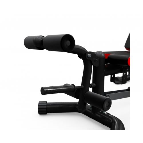 Рама скамьи изготовлена из высокопрочной стали с профилем 76x1.5 мм, что гарантирует ее долговечность и надежность. Валики для ног могут быть дополнительно утяжелены дисками для повышения эффективности тренировки. Благодаря специальной конструкции скамья обладает высокой устойчивостью и безопасностью использования.