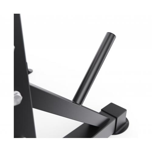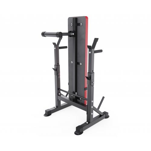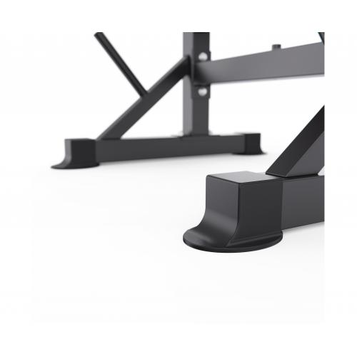 - Модель оснащена стойками под штангу с регулировкой по высоте на 5 уровней, что позволяет легко адаптировать скамью под рост пользователя и различные упражнения. Регулировка спинки на 4 уровня расширяет функциональность тренажёра и даёт возможность изменять угол нагрузки.