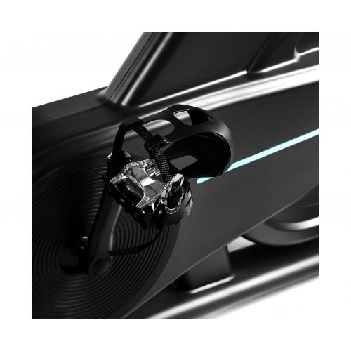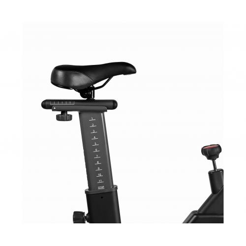 - Спортивное сиденье регулируется не только по высоте и горизонтали, но и углу наклона, таким образом меняя интенсивность тренировки и положение пользователя в седле. Руль также регулируется по высоте, внося разнообразие и делая тренажёр более комфортным. Спин-байк рассчитан на пользователя весом до 130 кг.