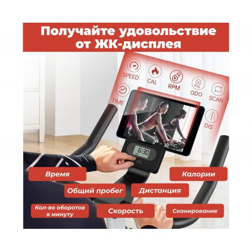 - Велотренажер имеет монохромный LCD-дисплеей, который отображает ключевые параметры тренировки: время, калории, дистанцию, скорость, сканирование и пульс. Это позволит отслеживать прогресс и корректировать нагрузку в реальном времени. Для работы консоли используются батарейки типа AAA (2 шт), которые входят в комплект - удобно и не требует подключения к сети.