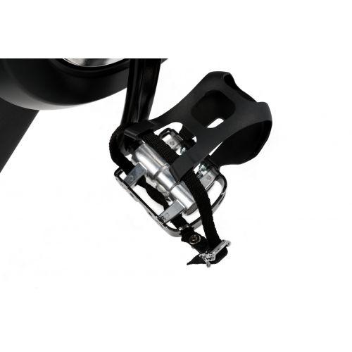 Тренажер может быть оснащен как классическими педалями с клипсой, так и вариантом SPD педалей (фиксация без клипсы). Прочный хромированный маховик массой 21,8 кг и магнитная тормозная система обеспечивают тихий, плавный ход и эффективное торможение. Интегрированная консоль отображает количество вращений педалей в минуту RMP, время, количество сожженных Ккал, пройденную дистанцию и затраченное время. Кроме того, модель совместима с беспроводным поясом контроля пульса, что позволяет контролировать комфортную пульсовую зону и эффективно достигать результатов.