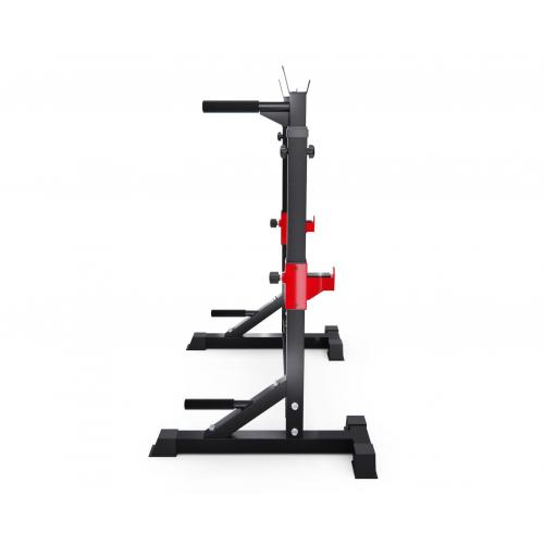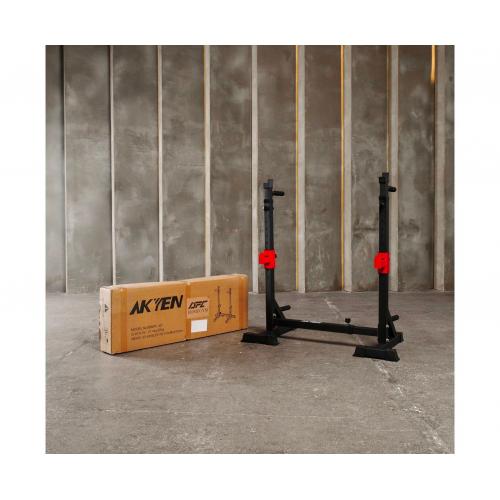 Стойка под штангу с брусьями DFC AKYEN J07 для домашнего использования. Шаг регулировки высоты 5 см, а регулировки ширины – 16,5 см. Регулируемая стойка для приседаний AKYEN 3-в-1.