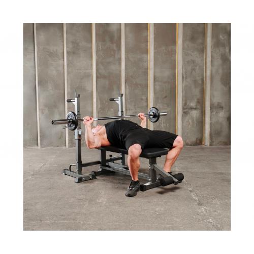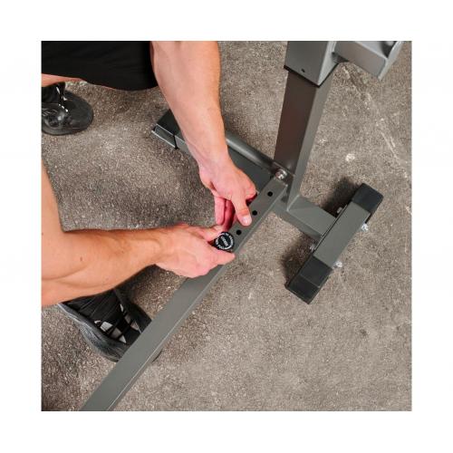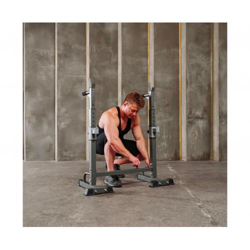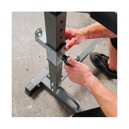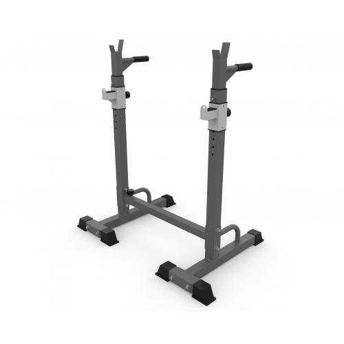 - Многофункциональная стойка для домашнего спортзала. Подходит для выполнения полного спектра упражнений со штангой: от приседания и становой тяги до жима лежа. Приятное дополнение – стойки для отжиманий от пола.