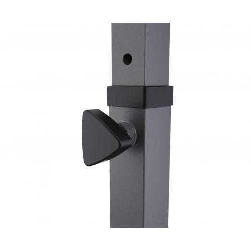 - Высота держателей под штангу легко регулируется без дополнительных инструментов при помощи ручки. Держатели под штангу стойки для жима регулируются по высоте на 7 уровней в диапазоне от 100 до 170 см (шаг 10 см). Нескользящие ножки надежно устанавливаются на полу и не царапают поверхность.