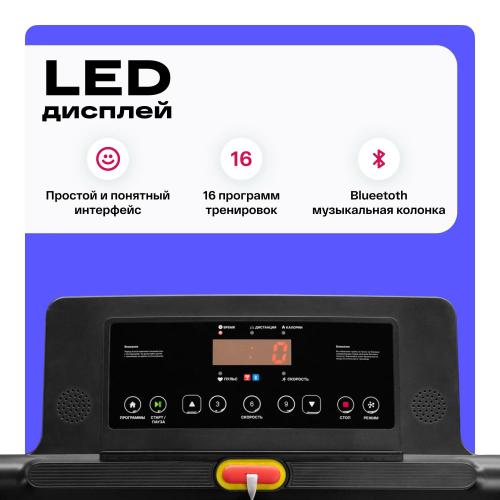 - LED-дисплей консоли с понятным интерфейсом на английском языке отображает основные параметры тренировки: время, скорость, дистанцию, количество потраченных калорий и пульс. Встроенные сенсорные датчики позволяют отслеживать пульс прямо во время занятий. Для удобства пользователя дорожка оборудована Bluetooth-колонкой для прослушивания музыки с телефона и подставкой для смартфона или планшета.