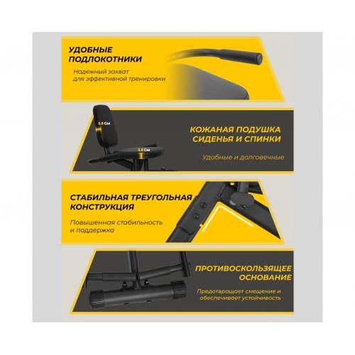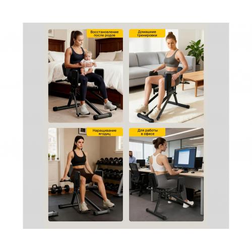 - Вращающиеся на 360° подушки для бедер и удлинённые педали обеспечивают естественные движения и удобную посадку, а эргономичные ручки возле сиденья повышают устойчивость во время выполнения упражнений. Расстояние между правой и левой ручкой около сиденья составляет 54,8 см, сопротивление регулируется с помощью эластичного троса с тремя уровнями натяжения.