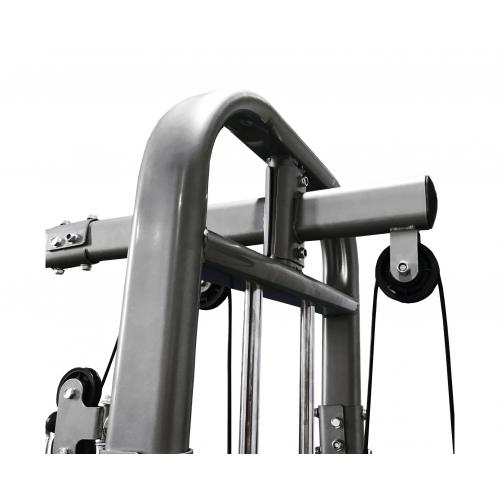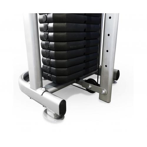 Силовые стеки весом по 75 кг входят в комплектацию. Вес пластин — 4 и 5 килограмм. Общая нагрузка регулируется при помощи фиксатора одним движением руки. Плавность хода стеков гарантируют ролики на подшипниках. Основа всей конструкции — рама из трубы размерами 40 х 80 х 1,5 мм.