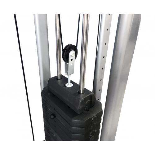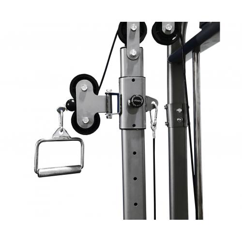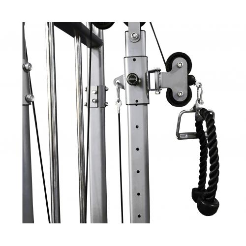 В комплектацию входит канат для упражнений на трицепс и бицепс (сгибания, разгибания рук), мышцы плеч и кора (упражнение «священник»). Канат крепится к регулируемой по высоте каретке.