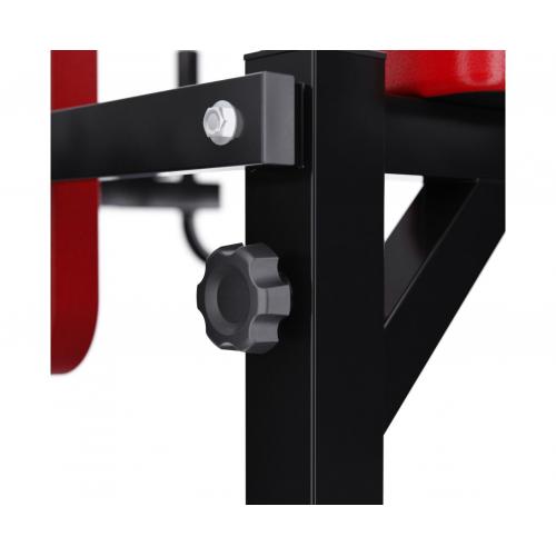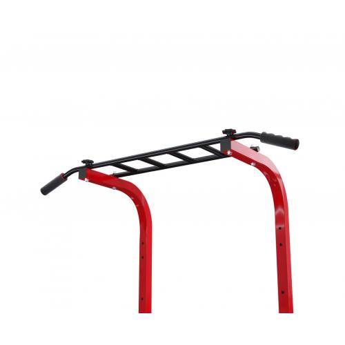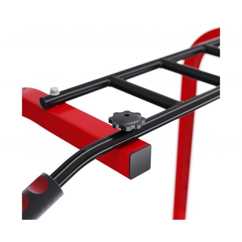 - Высота тренажёра регулируется на 9 уровней от 150 до 220 см от пола, что позволяет адаптировать его под рост любого пользователя. Расстояние между крайними перекладинами для подтягиваний составляет 40 см, а ширина турника — 106,5 см. Расстояние между брусьями — 56,5 см внутри и 75,5 см снаружи. Длина ручек для отжиманий составляет 11,5 см.
